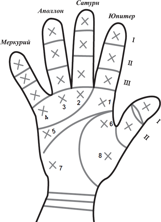 III фаланга – четкий крест на этой фаланге – перед нами вульгарный, ненадежный человек с дурным характером, ведет аморальный образ жизни, как правило, такой человек причина бед и несчастий для своих близких людей и друзей.