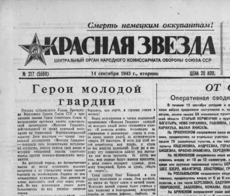 Передовица «Красной звезды» от 14 сентября 1943 г. с заметкой о награждении членов «Молодой гвардии»