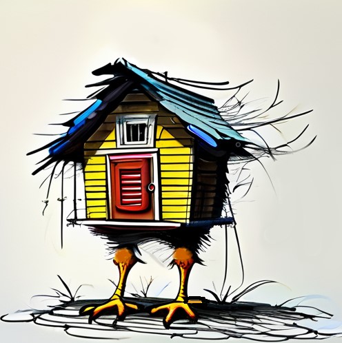 Вдали показалась избушка Бабы-яги, старая, перекошенная и какая-то корявая. Она стояла на курьих ножках. Вдруг одна нога поднялась и почесала другую. Девочке стало смешно.