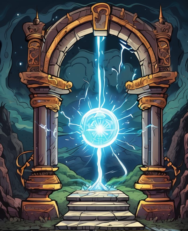 Сзади качелей она увидела необыкновенное диковинное сооружение – изящную арку с маленькими башенками-пиками. Перед аркой несколько маленьких ступенек, а посередине вообще что-то невообразимое! Сверкающий, живой, ходящий из стороны в сторону круг, от которого в разные стороны отходили яркие маленькие молнии.