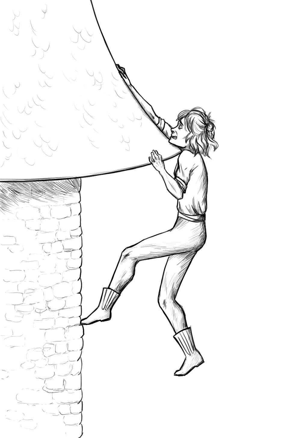 Я дотянулась ногой до каменной стены башни и попыталась упереться в малюсенький выступ неровного камня.