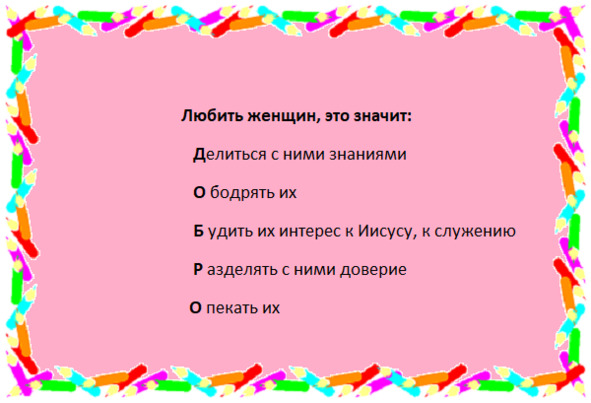 Сегодня стоит задуматься над тем, что мы путаем понятие «подруга» с «дружелюбными приятными людьми», просто приятными для меня. Такие взаимоотношения не имеют стратегического значения, закончился полет самолета, и кончились отношения с соседом пассажиром. Такие отношения могут быть и в женской команде, провели с коллегой мероприятие, это конечно неплохо, но это не дружба. В подлинной команде всегда идет духовный рост. В такой команде просят у Иисуса не для себя в первую очередь, а для подруги. Вас может удивить, почему я все это рассказываю, неужели это ободрит? Думаю, что учитывая и учась на чужих ошибках, можно избежать своих, да и нужно их избежать.