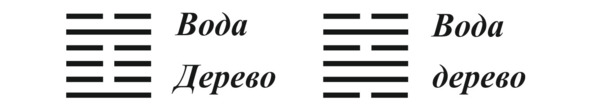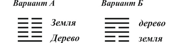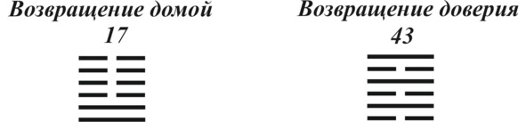 Здесь исходная гексаграмма №17 и производная №43. Чтобы произошло такое превращение, необходимо изменить линии 1, 4 и 6 на противоположные.