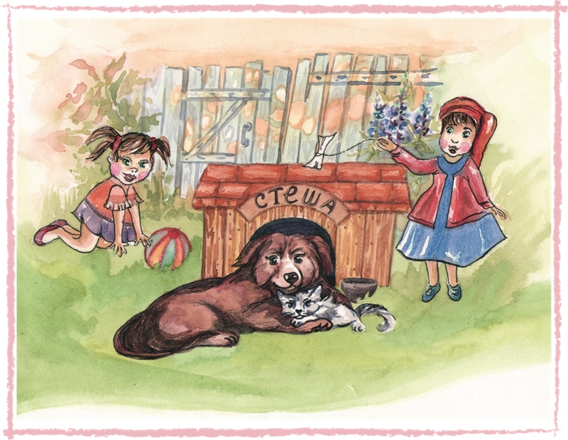 Они направились в другой конец сада, где недалеко от калитки была собачья будка. А в этой собачьей будке… О чудо! Мирно спали, прижавшись друг к другу, собака Стешка и её новый дружок – маленький беспомощный котёнок.