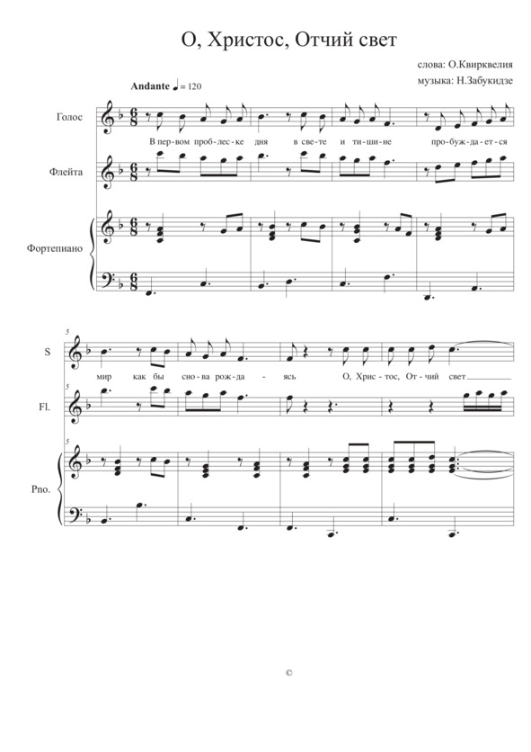 Стихните, ветры, уймитесь, метели!Видите – солнце уже побледнело,Звёзды на Землю спускаются низко —Ибо Господь уже близко!Приготовьте пути Господу!Приготовьте души свои!ПЕСНИ О. КВИРКВЕЛИЯ
