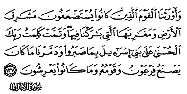 «Мы даровали в наследие тем, которых считали слабыми, восточные и западные земли, которые Мы благословили. Сбылось прекрасное Слово твоего Г-спода о сынах Исраила (Израиля), поскольку они проявили терпение. Мы разрушили то, что содеяли Фараон и его народ и что они воздвигали».
