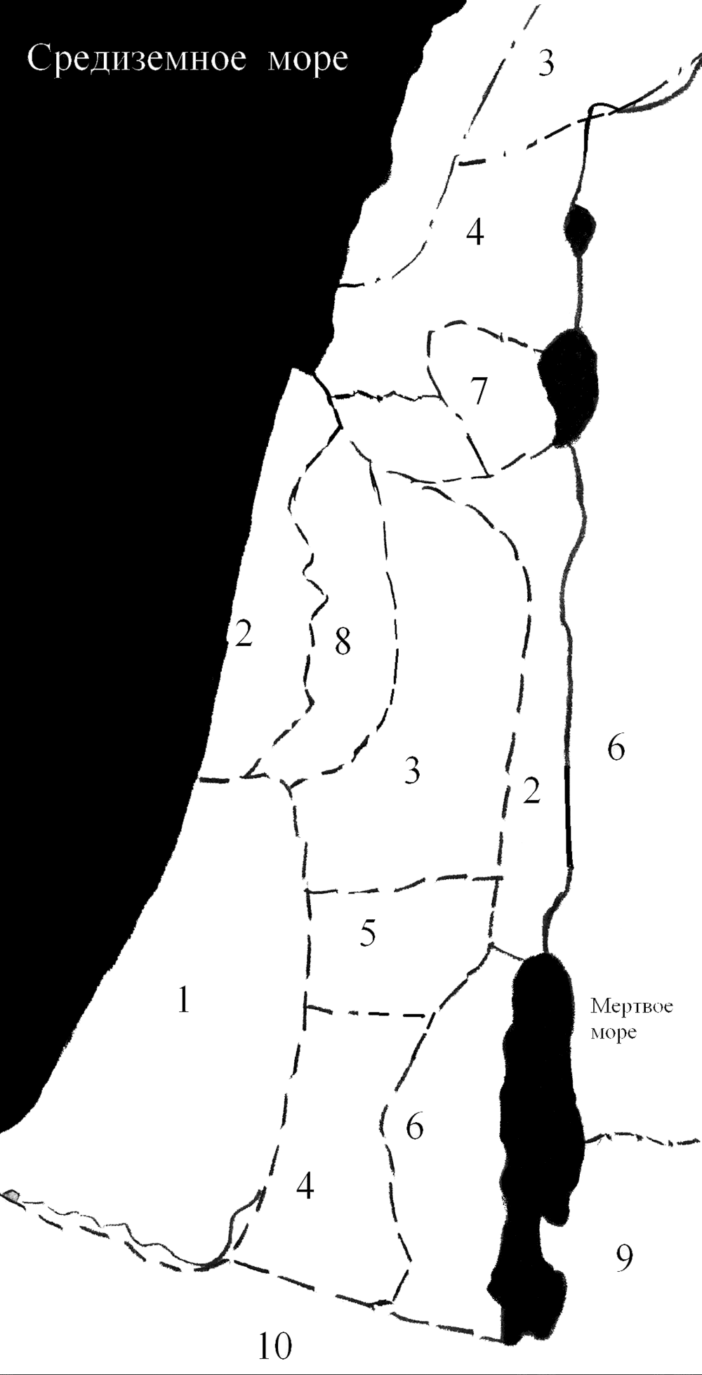 Илл.1. Карта-схема Ханаана и страны Амореев. 1 – филистимляне, 2 – ханаанеи, 3 – евеи, 4 – хеттеи, 5 – иевуссеи, 6 – амореи, 7 – гергесеи, 8 – ферезеи, 9 – моавитяне, 10 – эдомяне.