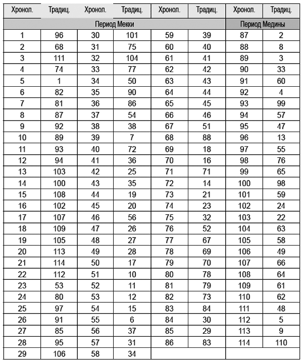 Таблица хронологической нумерации глав (сур) Корана и параллельно – нумерация традиционная