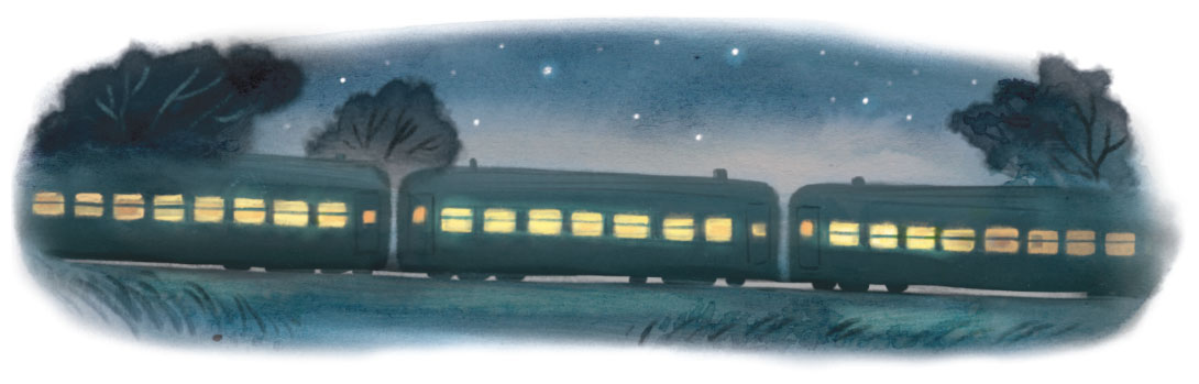 Ваня первый раз ехал в поезде. Он представлял, как сладко будет спать в дороге. Но вот уже битый час его качало в разные стороны на полке, а сон всё не шёл. Мальчик закрыл глаза, вслушиваясь в шум колёс.