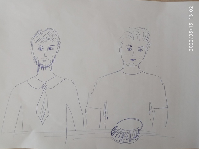 Напротив них, на стульях, два юноши: один бородатый, другой тучный, в черной маске.
