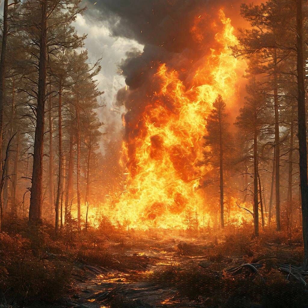Лисы , лоси ,кабаны ,зайцы и другие жители леса. Разбегались в разные стороны сбивая друг друга . На бегу многие спотыкались и падали и тогда их могли в суматохе просто затоптать . Яша очень испугался и не знал в какую сторону ему бежать. Он увидел огромного лося который своими ветвистыми рогами на скаку ломал ветки деревьев и ломал копытами не маленькие кустарники . Енотик отскочил в сторону и помчался не разбирая тропок и путей отхода, от ревущего и все поглощающего на своем пути пожара. Сжигающего все и вся не оставляя ни чего живого.