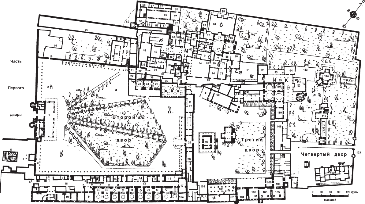 В одной из следующих глав мы прочтем, что открытый для доступа просителей Первый двор с внешней стороны был окружен толстой стеной и что желающие быть принятыми в Диване попадали в этот двор через находившиеся в ней Центральные ворота. Лишь одному султану было разрешено въезжать через них верхом на лошади. Из Второго двора в Дом блаженства можно было попасть только через Ворота блаженства, причем это дозволялось только домочадцам султана.
