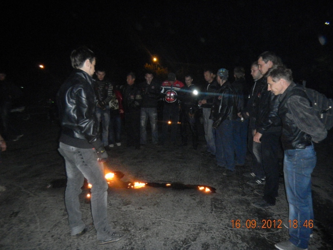 Встреча состоялась 18го сентября. В этот день мы проводили мотопробег в память о погибших байкерах. Т.к. большинство в этот день было на работе, пробег проводился вечером. Конечной точкой нашего маршрута была площадка возле ГП «Донбассантрацит». Подъехали мы туда уже затемно. Сначала хотели зажечь свечи в память о погибших, но сильный ветер помешал это сделать. Тогда кто-то предложил вылить на асфальте крест бензином и поджечь его. Память погибших почтили минутой молчания.