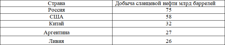 Распределение самых больших в мире запасов сланцевой нефти (по состоянию на 2013 год) представлено в таблице 1.