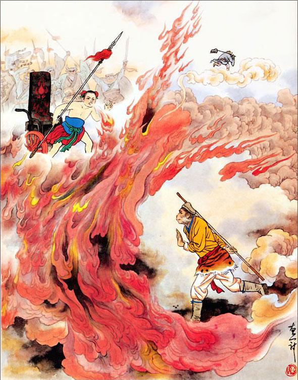 Вобрав в себя нитку, Великий Мудрец обошел гору с востока и издали увидел Танского монаха, который катался по земле от горя и плакал навзрыд. Тем временем Чжу Ба-цзе и Ша-сэн делили поклажу.
