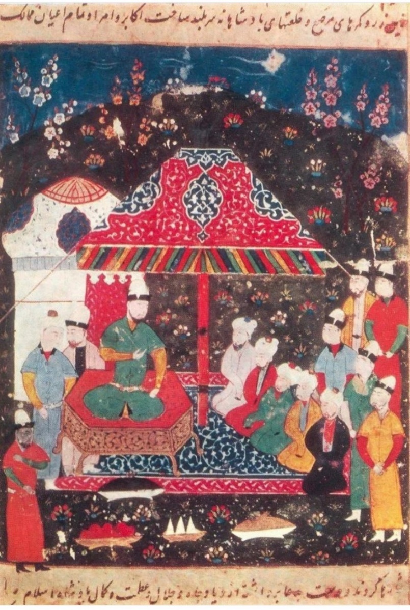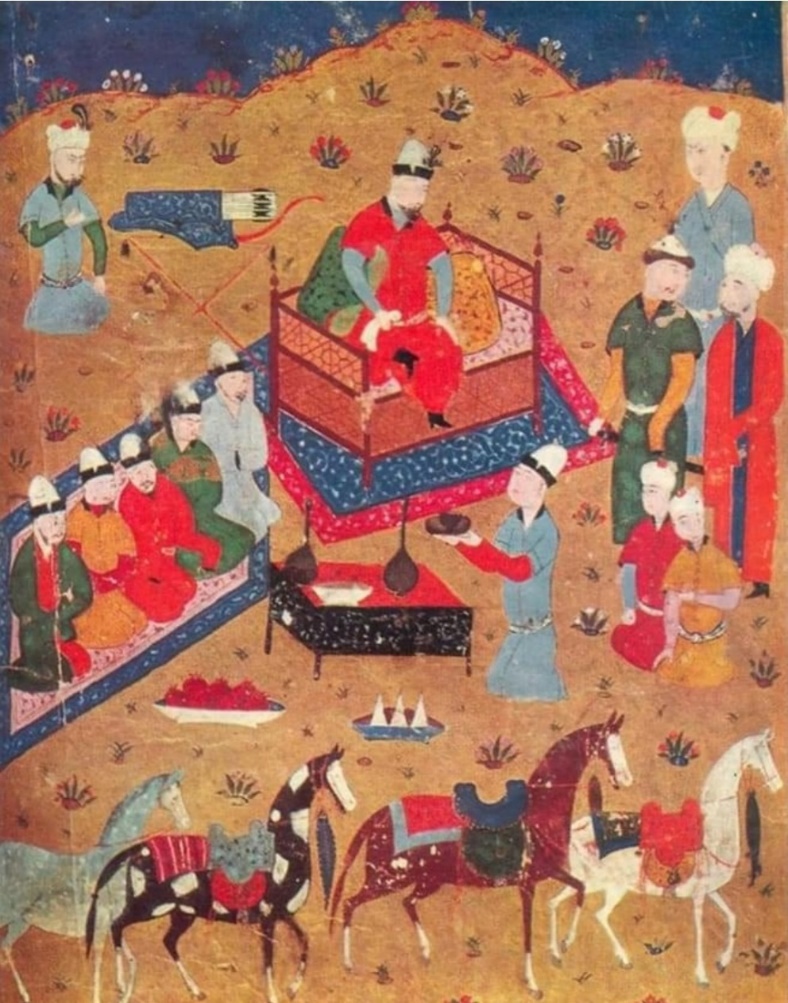 Газан хан в своем драгоценном шатре в Урджане задает пир знати, Масуд ибн Осман-и Кухистани. «История Абулхайр-хана». Рукопись ИВ АН УзССР, 9989, л. 173. 1540-е гг., Самарканд.