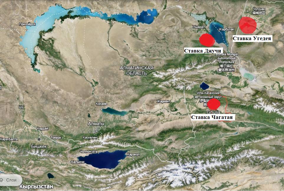 Ставка Джучи находилась на Иртыше, его старшего сына Орда-Ичена – около оз. Алакуль, Угедея (а затем его сына Гуюка) – в долине р. Эмел, Чагатая – к западу от Алмалыка (развалины около г. Кульджа) (5, с. 17). Тулуй же умер от болезни. Ставки сыновей Чингисхана локализовались на территории Семиречья (на границе между современным Казахстаном и СУАР), где в последствии возникнет и сам Моголистан (юрт монголов).