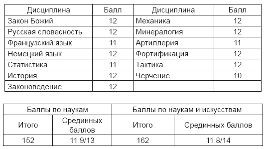 Таково было состояние кадетского корпуса, когда в нем учился Н. Н. Обручев. Идеал воспитанника кадетских корпусов был указан в «Наставлениях для образования воспитанников Военно-учебных заведений» за 1848 год, составленных Я. И. Ростовцевым: «Христианин, верноподданный, русский, достойный сын, надежный товарищ, скромный и образованный юноша, исполнительный, терпеливый и расторопный офицер»35. Обручев хорошо служил и учился – 8 марта 1846 года он получил первое звание – стал унтер-офицером36. Кадеты в зависимости от успеваемости распределялись в роту Его Величества и мушкетерскую роту, и на специальные и обычные курсы. Успеваемость кадета 2-го отделения 2-го класса специального курса Обручева была высока (в корпусе была принята 12-балльная система оценок)37: