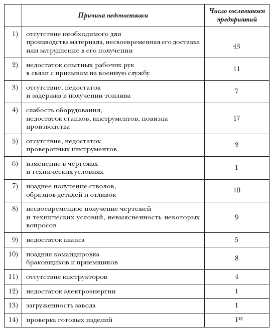 Обращает на себя внимание тот факт, что из 120 перечисленных случаев ссылок на причины срыва поставок 50 относятся к области, в которой руководители ВПК считали себя специалистами, – организации поставок материалов, сырья и топлива. На фоне этого проблема проверочных инструментов (2 случая), изменение в чертежах (1 случай) и даже новизна производства (17 случаев) явно отходят на второй план. Провал был полным.