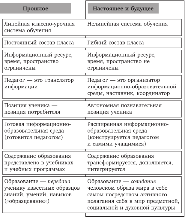 В постиндустриальную эпоху происходит содержательное преображение самого знания, его реструктуризация, что ставит перед необходимостью учить школьников самостоятельно приобретать новые знания, освобождаться от стереотипов, от устаревшей информации. Это предполагает применение не только линейных, логико-рациональных способов познавательной деятельности, но также и нелинейных способов, связанных с миром образов, эмоций, чувств, с формированием целостной картины мира. Особенно важно это при интенсивном развитии информационно-коммуникативных технологий и средств связи, глобальных компьютерных сетей, когда у обучающегося еще не сформирована устойчивость к информационной зависимости. В существующих условиях в образовательном процессе важно выйти на применение процедур понимания, проектирования, рефлексии, коммуникации.