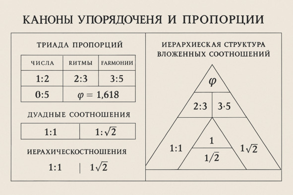 Сводная таблица и иерархическая диаграмма пропорций: от дуад и золотого сечения к вложенной структуре гармоний. Сопоставление чисел, ритмов и отношений отражает многомерные каноны природного порядка в модели ЕТППО и философии Сфирали.