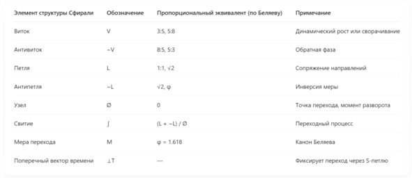 Ниже представлена таблица, в которой элементы Сфирали соотносятся с каноническими пропорциями и ритмами из теории Беляева.