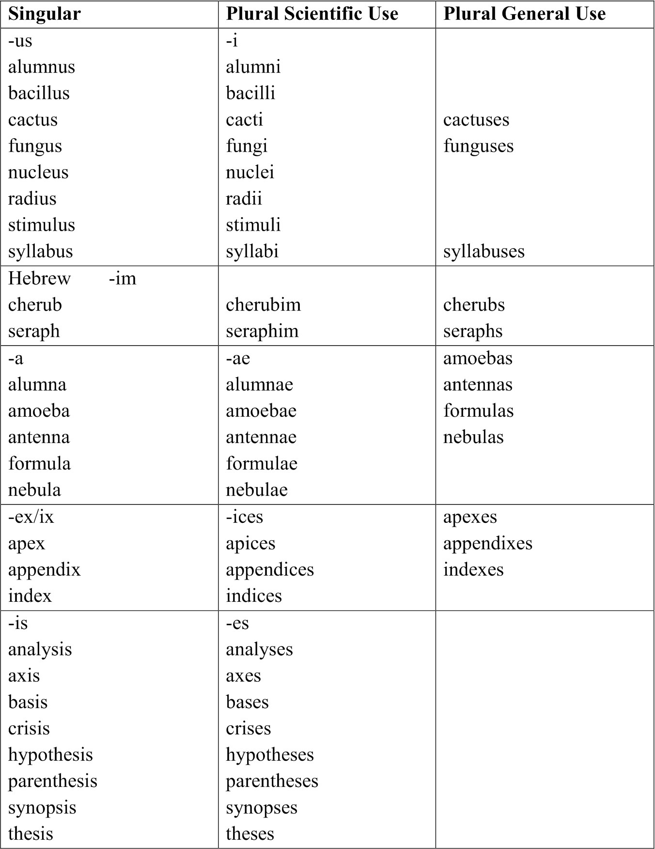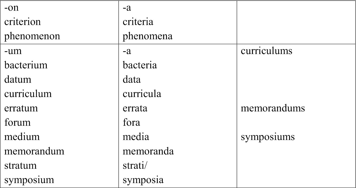 Nouns Keeping Foreign PluralsPlurals of the nouns of Latin, Greek, and Hebrew origin are often used in English scientific writing even though their English plurals may exist in general use.
