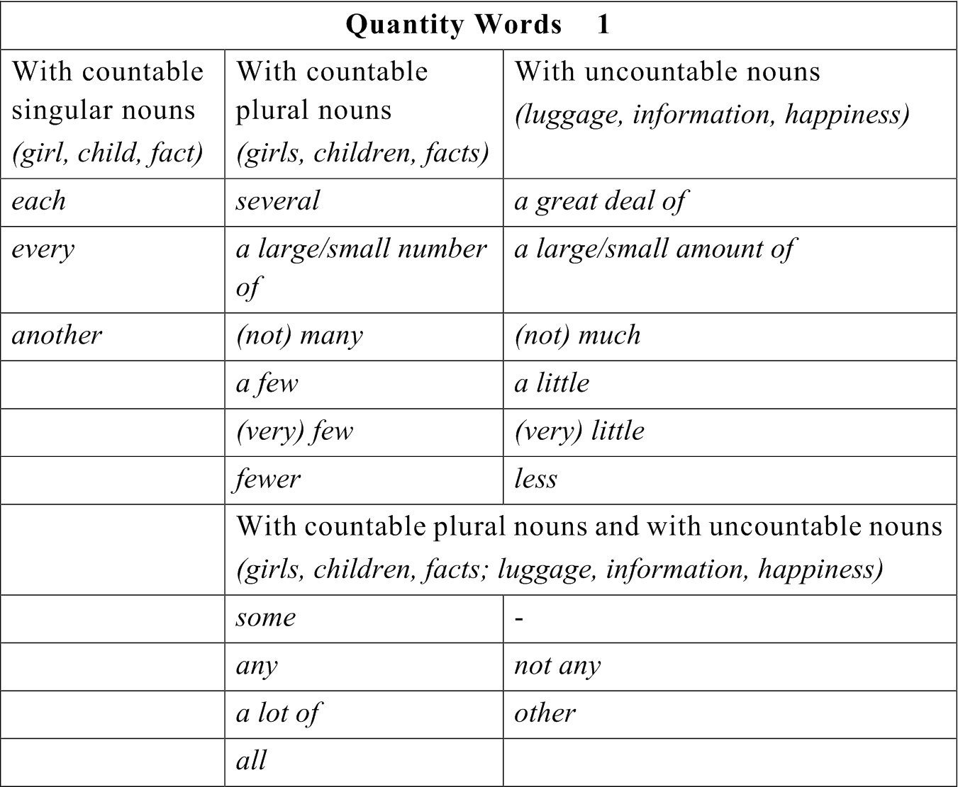 Some quantity words can he used only with uncountable nouns, with countable singular nouns, or with countable plural nouns. Others can be used with both uncountable nouns and countable plural nouns. Refer to the following chart for correct usage.