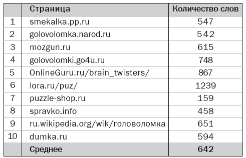 Откуда интернет-маркетологи знают, какого объёма требуется текст для продвижения? Требования к объёму формируются на основе анализа страниц сайтов, найденных поисковой системой. Для примера проверим, какого объёма тексты поисковая система Яндекс находит для запроса «головоломки». В таблице 2.1 приведены результаты анализа первых 10 ссылок, показанных поисковой системой Яндекс.