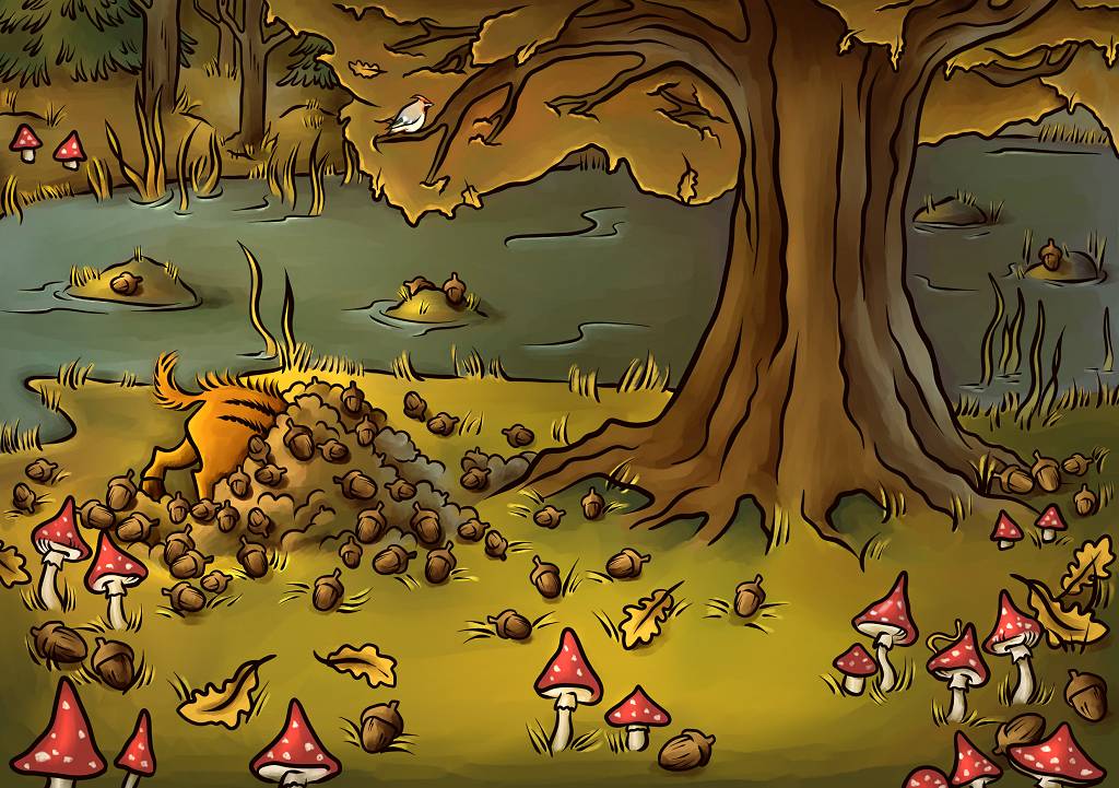 Каждый год к осени дерево скидывало с себя уйму желудей, но нынче их было на порядок больше, что безусловно и привлекало одного из местных обитателей, который копошился тут уже четвертый день кряду. Недалеко от дерева к лесу прилегало небольшое на первый взгляд болотце, плавно переходящее в глубинах леса в километровые топи. Густой желудевый ковер был постелен стариком дубом не только по полю, но и на части болота, будто приглашая здешних обитателей войти в лес. Помимо желудей опушку покрывала тьма мухоморов. Экземпляры на любой, как говорится, вкус и размер.