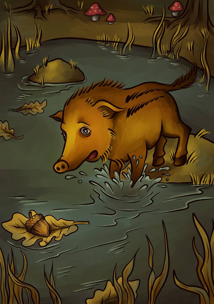 Погода в последние дни стояла дождливая, и болото становилось непроходимым. Настал день, когда кабанчик уже не смог отыскать на твердой земле наивкусейшие привлекательные плоды, и его внимание переключилось на груды желудей, лежащих в топких местах.