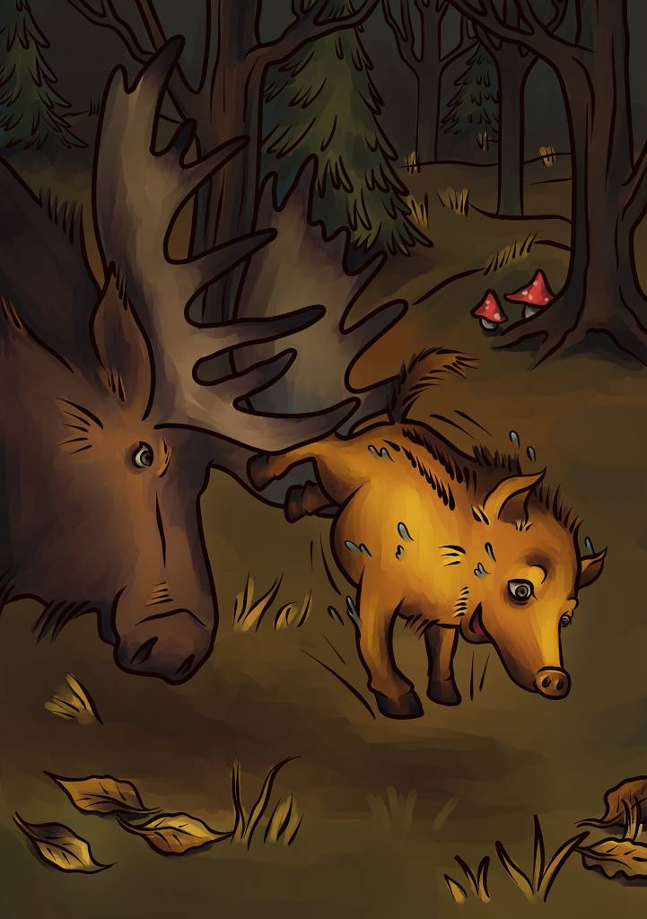 По счастливой случайности к той самой опушке каждый вечер приходил лось, и приходил он туда не просто так. Для него в этом лесном оазисе природой тоже были подготовлены угощения: мухоморы, ряды которых, к удивлению поросенка, редели словно по волшебству. Немного неуклюже ступая длинными ногами, лось из глубины болот все ближе подбирался к своему ужину. Чем меньше становилось расстояние до цели, тем чаще лось улавливал странные звуки, похожие на хлюпанье и поросячий визг, и когда опушку уже можно было разглядеть, рогатый великан увидел у края болота маленького кабанчика, из последних сил повизгивающего и похрюкивающего.