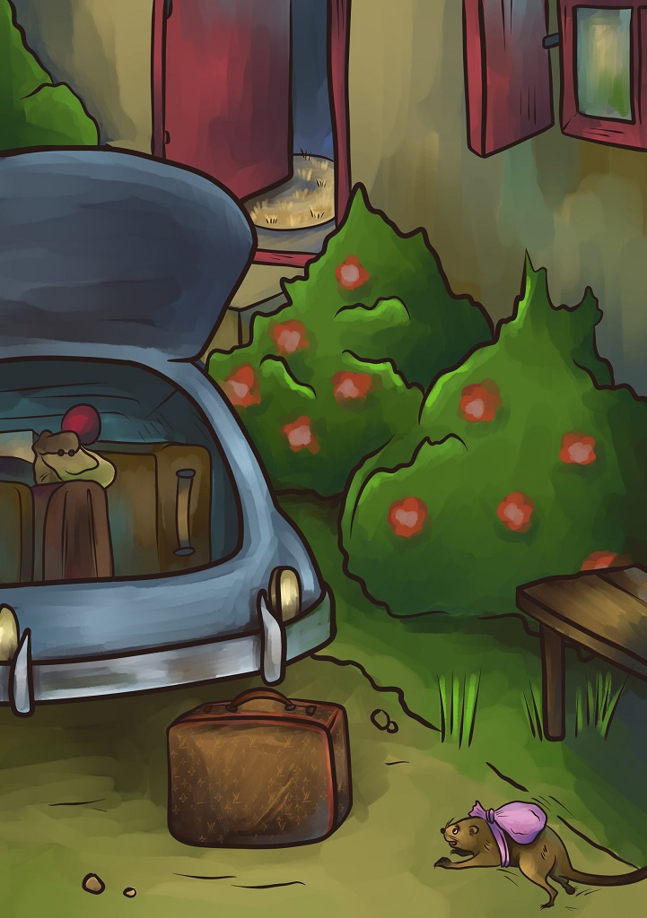 Набив узелок до отказу, она понеслась искать укромное место в автомобиле. Багажник был еще открыт, когда крыса со своим багажом подскочила к нему. Закинув свой узелок в багажник, зверек ловко запрыгнул следом и спрятался между двумя коробками, быстро устроив себе уютное местечко с помощью вещей, добытых из ближайших коробок. Самым удачным в выбранном закутке стала щелочка между сиденьями, через которую было прекрасно видны задние места в автомобиле. Именно туда усадили ребенка, и крыска успокоилась: виновница ее переезда была рядом. Резко хлопнула дверца багажника, затарахтел двигатель, машина тронулась.