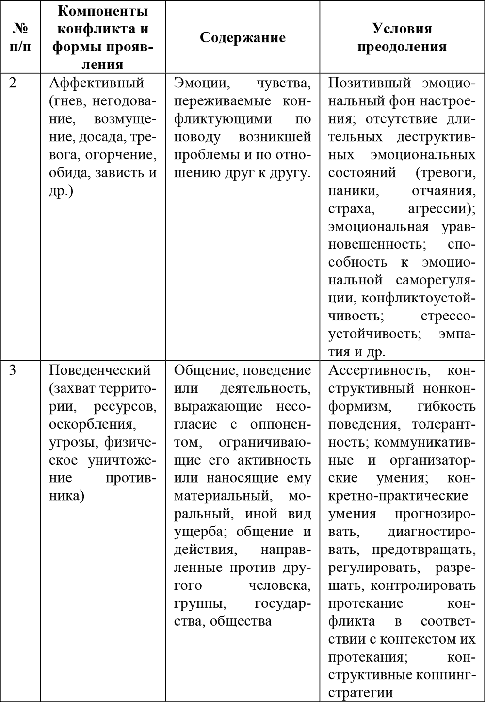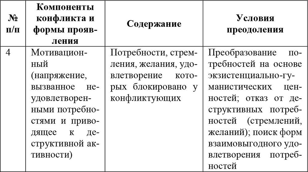 Таблица 2. Психологические компоненты конфликта и условия их преодоления/предотвращения