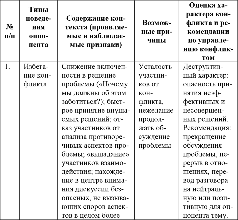 В этой связи в табл. 3 представлены внешне проявляемые и наблюдаемые признаки, свидетельствующие о типы поведения оппонента, по которым может строиться ответная стратегия. Также предложены рекомендации о возможных тактических действиях по управлению конфликтом (Разработана на основе: В. Латыпова [176]).