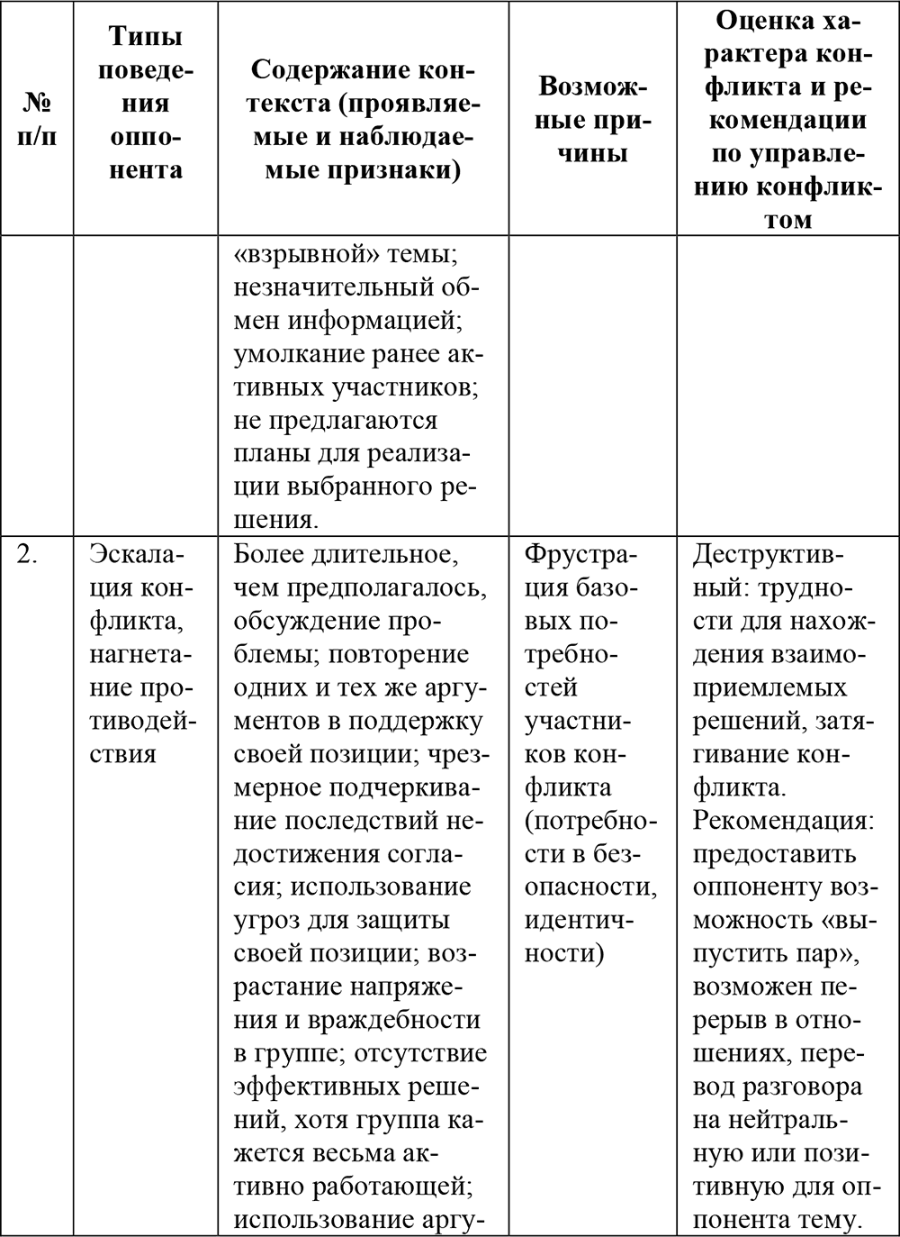 2) Эффективное управление конфликтом предполагает учет типа поведения оппонента, который предстает как один из контекстов управления конфликтом, наглядно проявляется в определенных признаках, наблюдая и понимая причины которых, можно дать оценку характера конфликту (деструктивный/конструктивный) и использовать соответствующие контексту формы поведения/действия, направленные в случае необходимости на его конструктивное преобразование.