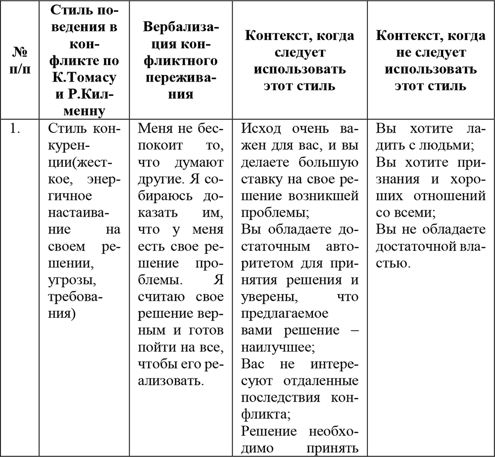 3) Широко известны предложенные К. У. Томасом следующие стратегии поведения сторон в конфликтной ситуации: уход, сотрудничество, соперничество, приспособление, компромисс. В качестве основания берутся характер, степень следования участника собственным интересам и мера учета интереса другой стороны. При этом невозможно говорить о единственно правильной и эффективной стратегии поведения в конфликте. В какой-то ситуации допустимым является один стиль, который совершенно не допустим в другой ситуации. В этой связи для эффективного управления конфликтом при выборе собственной стратегии поведения в конфликте необходимо исходить из характера контекста его протекания.