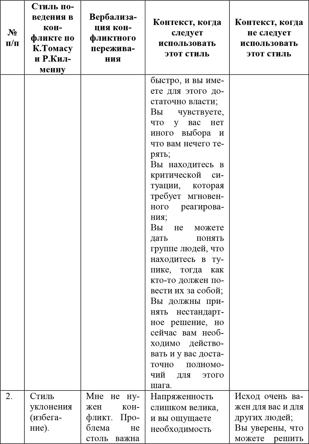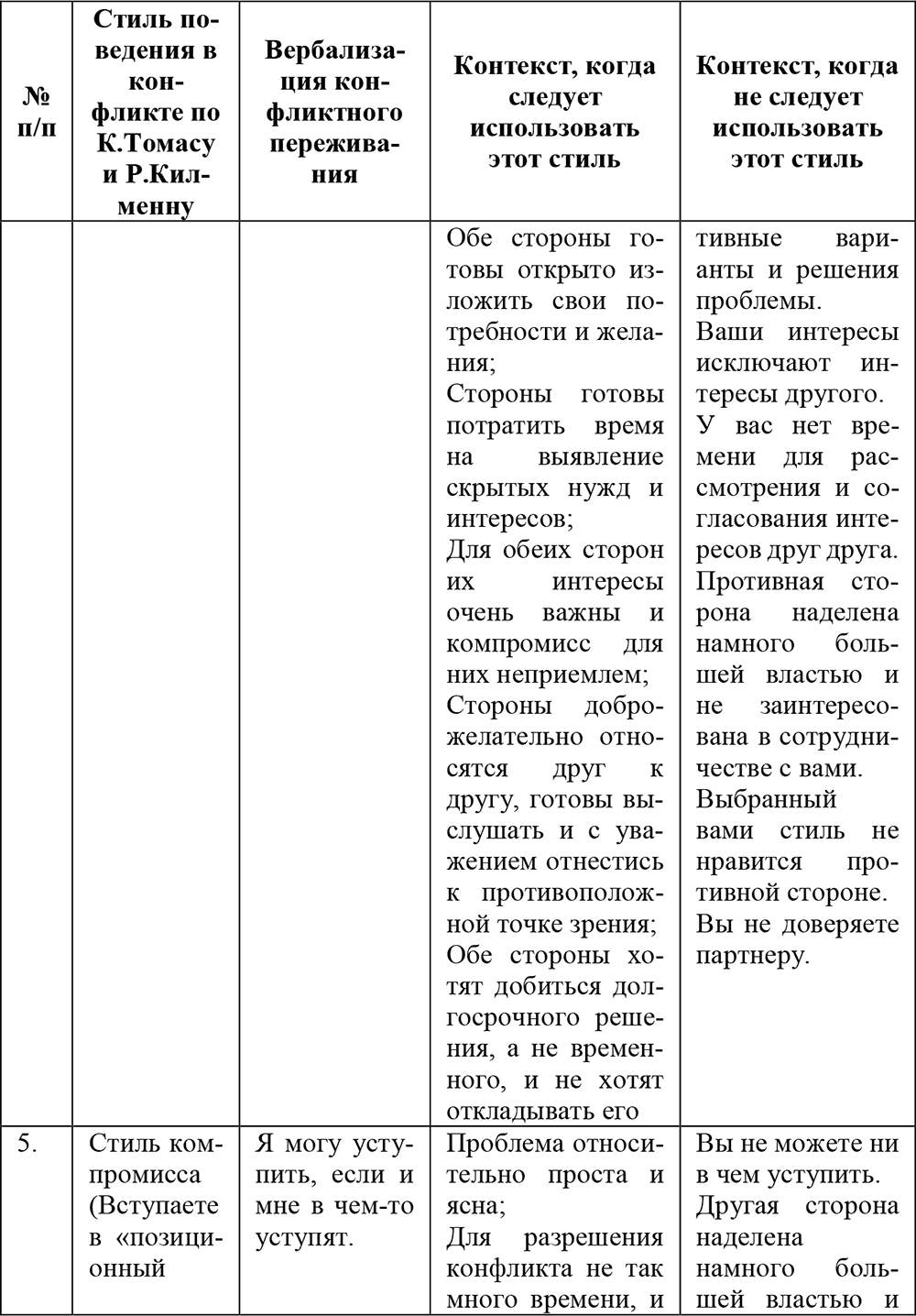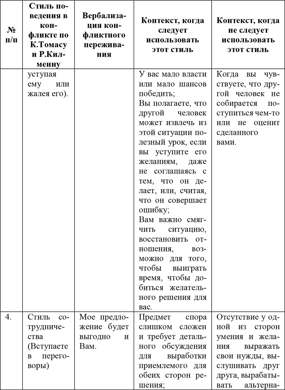 В табл. 4 представлены ситуации, позволяющие спрогнозировать, какой именно стиль поведения наиболее предпочтителен.