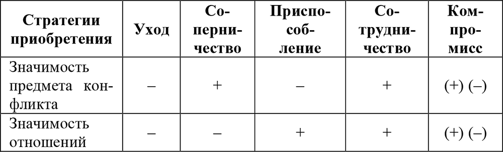 То есть, если более значимо сохранение отношений, то предпочтительны стратегии приспособления, сотрудничества и в определенной мере компромисса. Если более значим предмет конфликта, то предпочтительны соперничество, сотрудничество и компромисс. Как следует из таблицы – сотрудничество и компромисс предпочтительны в обоих случаях. Но при компромиссе стороны в чем-то готовы пойти на обоюдные уступки. В случае же сотрудничества подыскивается такой вариант решения проблемы, который в полной мере удовлетворяет потребности обеих сторон.