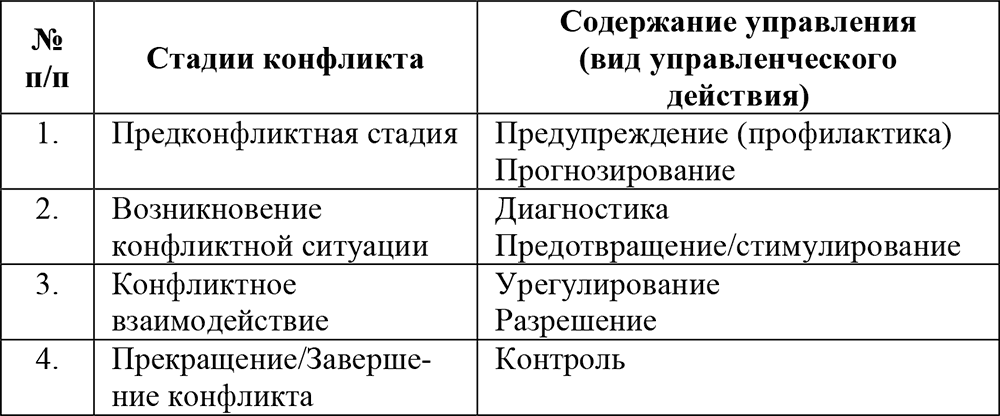 Таблица 6. Динамика (стадии) конфликта как контекст управления