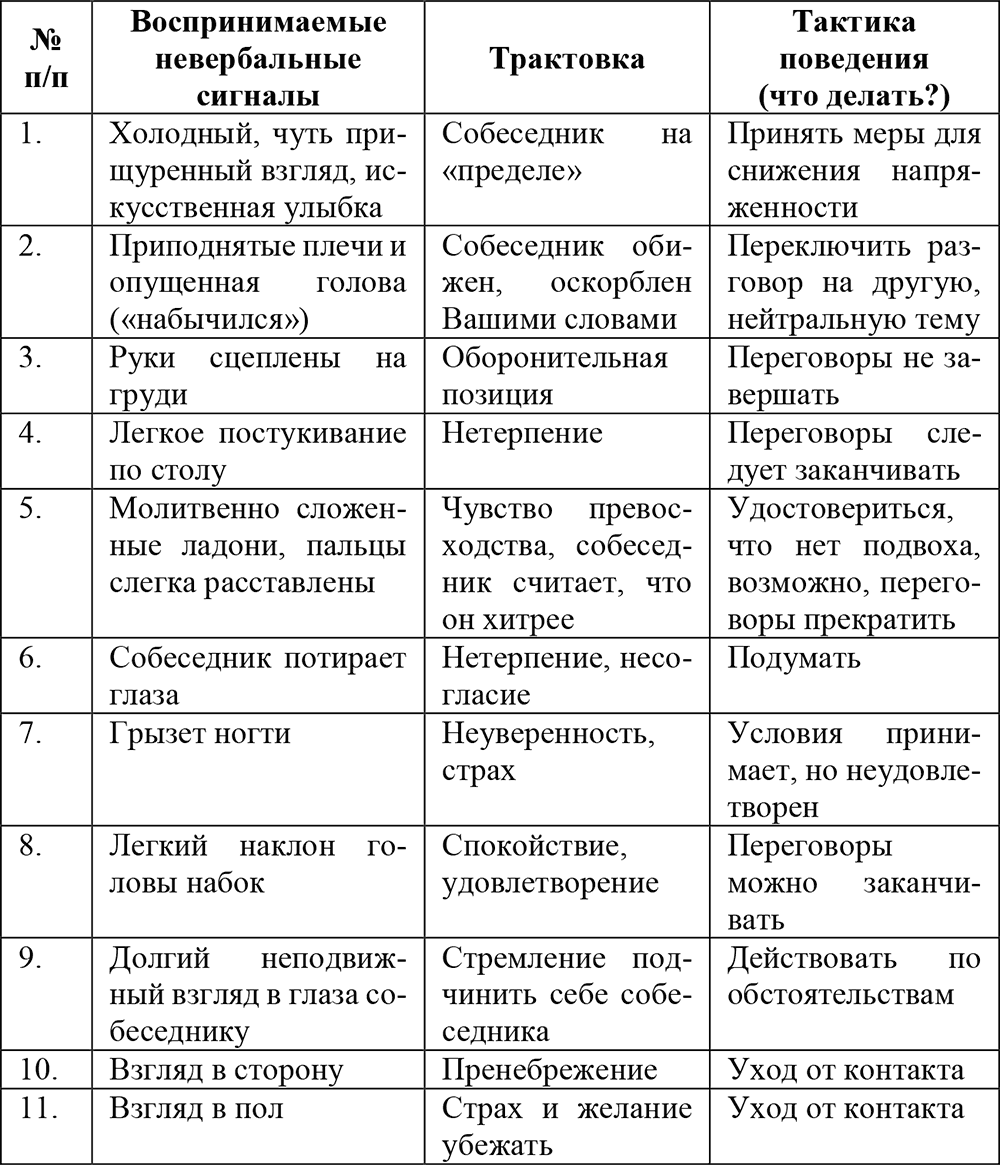 7) В некоторых случаях трудно понять характер напряженности в конфликте. Этому может способствовать умение читать невербальные сигналы, характер которых тоже может служить контекстом для выбора тактики поведения в конфликте. В целях предотвращения дальнейшей эскалации негативных отношений необходимо уметь «читать» эти невербальные сигналы. Приведем примеры некоторых из них и рекомендации по изменению стратегии своего поведения в ситуации переговоров (см. табл. 8; на основе модификация табл. Э. А. Уткина [321]).