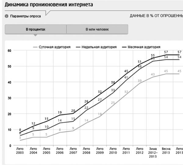 Статистика ВЦИОМ показывает, что интернет – второй по популярности источник получения информации о событиях в стране после телевидения. Так, из Сети предпочитают узнавать новости 23 % опрошенных, по телевидению – 60 %, при том, что 50 % людей в возрасте от 18 до 24 лет предпочитают Интернет остальным СМИ5. Больше половины (53 %) россиян в возрасте до 24 лет признались, что проводят слишком времени в интернете, а 44 % сказали, что подолгу засиживаются в социальных сетях6. Доля активной аудитории – это выходящие в Сеть хотя бы раз за сутки – сейчас составляет 45 % – 52,2 млн человек (рис. 1).