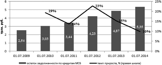В I полугодии 2014 г. темпы прироста кредитования малого и среднего бизнеса сократились более чем вдвое по сравнению с I полугодием 2013 г. Совокупный портфель банковских кредитов МСП вырос на 3,7 % (8,4 % за аналогичный период прошлого года) до 5,4 трлн рос. руб. (рис. 2.1).