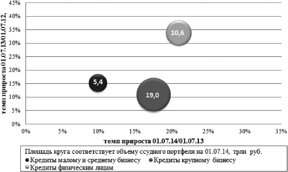Темпы прироста портфеля МСП впервые за последние три года оказались ниже темпов кредитования крупного бизнеса. На фоне ограничения доступа к иностранным рынкам капитала, российский крупный бизнес начал активнее фондироваться внутри страны, что позволило данному сегменту не только обогнать по темпам роста кредитование МСП, но и вплотную приблизиться к розничному кредитованию, которое было охлаждено политикой Банка России. За период 01.07.2013–01.07.2014 гг. кредитование крупного бизнеса выросло на 17,5 %, розничный сегмент – на 20,9 % (рис. 2.2) [7].