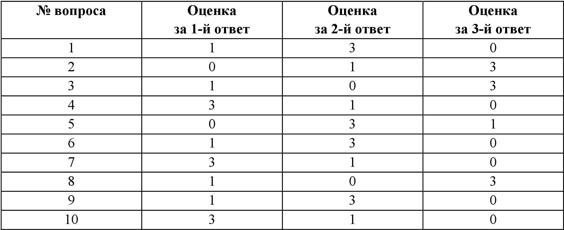 КлючКоличество баллов, которые можно получить за каждый из трех ответов на вопросы анкеты: