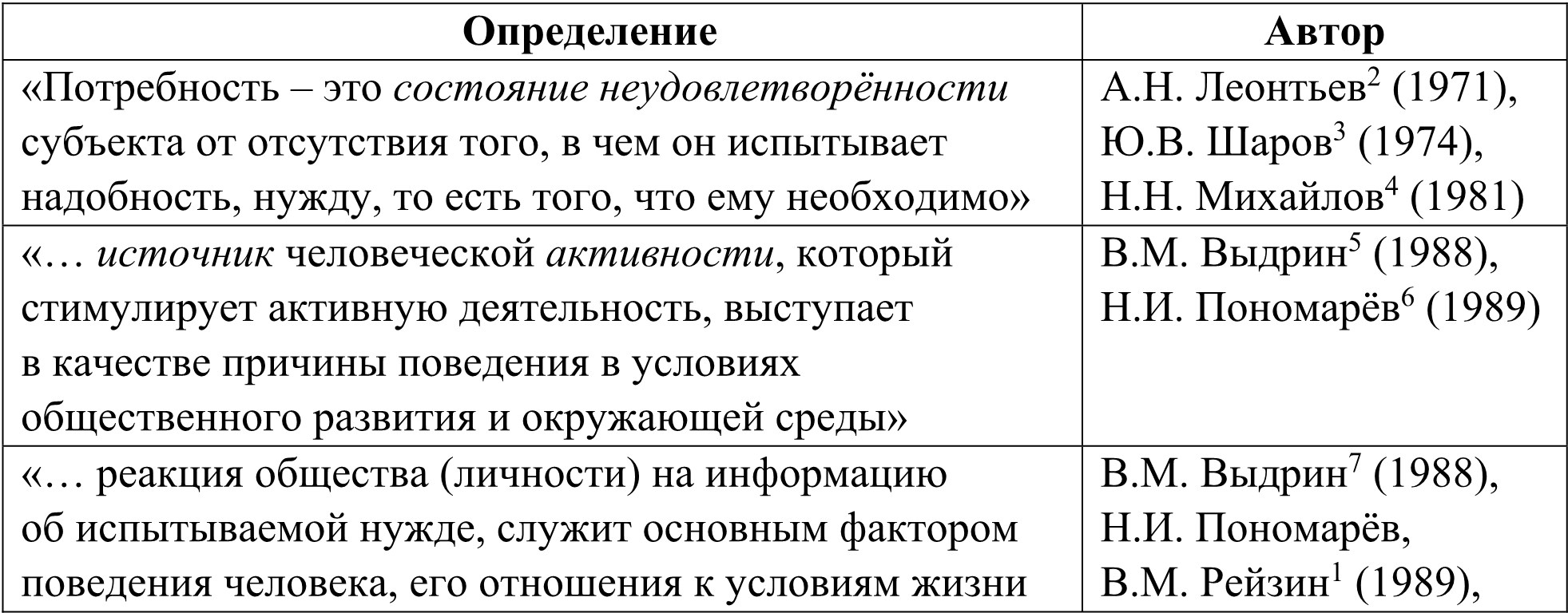 Поскольку значительное число специалистов определяет мотив как потребность, мы считаем необходимым разобраться в сущности данного понятия (табл. 1.5).