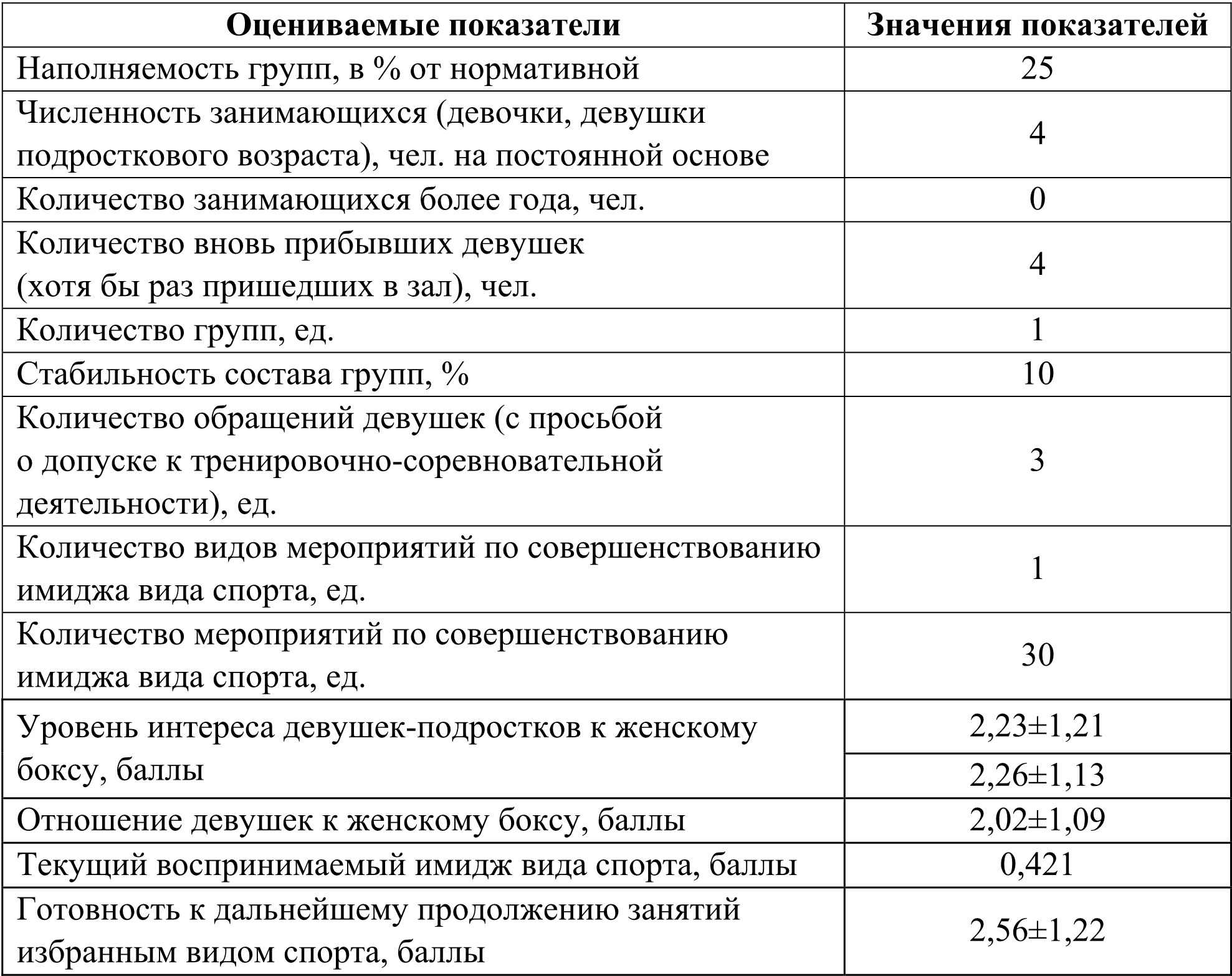 В табл. 3.6 представлены исходные показатели работы РОО «ТЕРРИТОРИЯ БОКСА» г. Санкт-Петербурга по формированию интереса к женскому боксу.