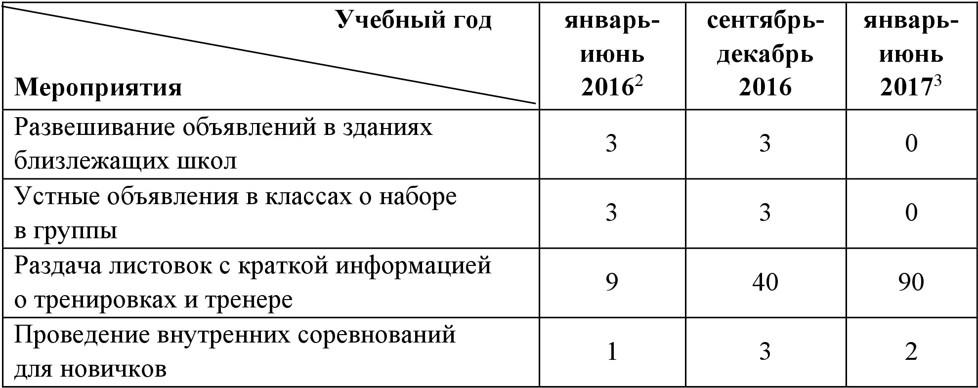 В табл. 3.7 приведён перечень видов мероприятий по формированию интереса к женскому боксу, организованных в РОО «ТЕРРИТОРИЯ БОКСА» г. Санкт-Петербурга (графа 1), и динамика их количества в период эксперимента (графы 2–4).