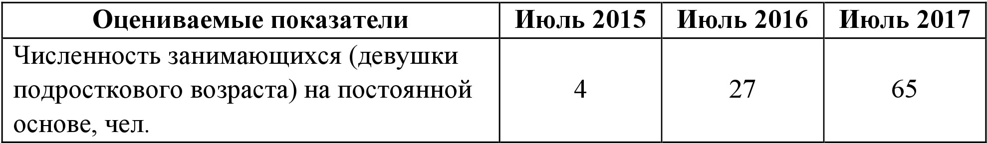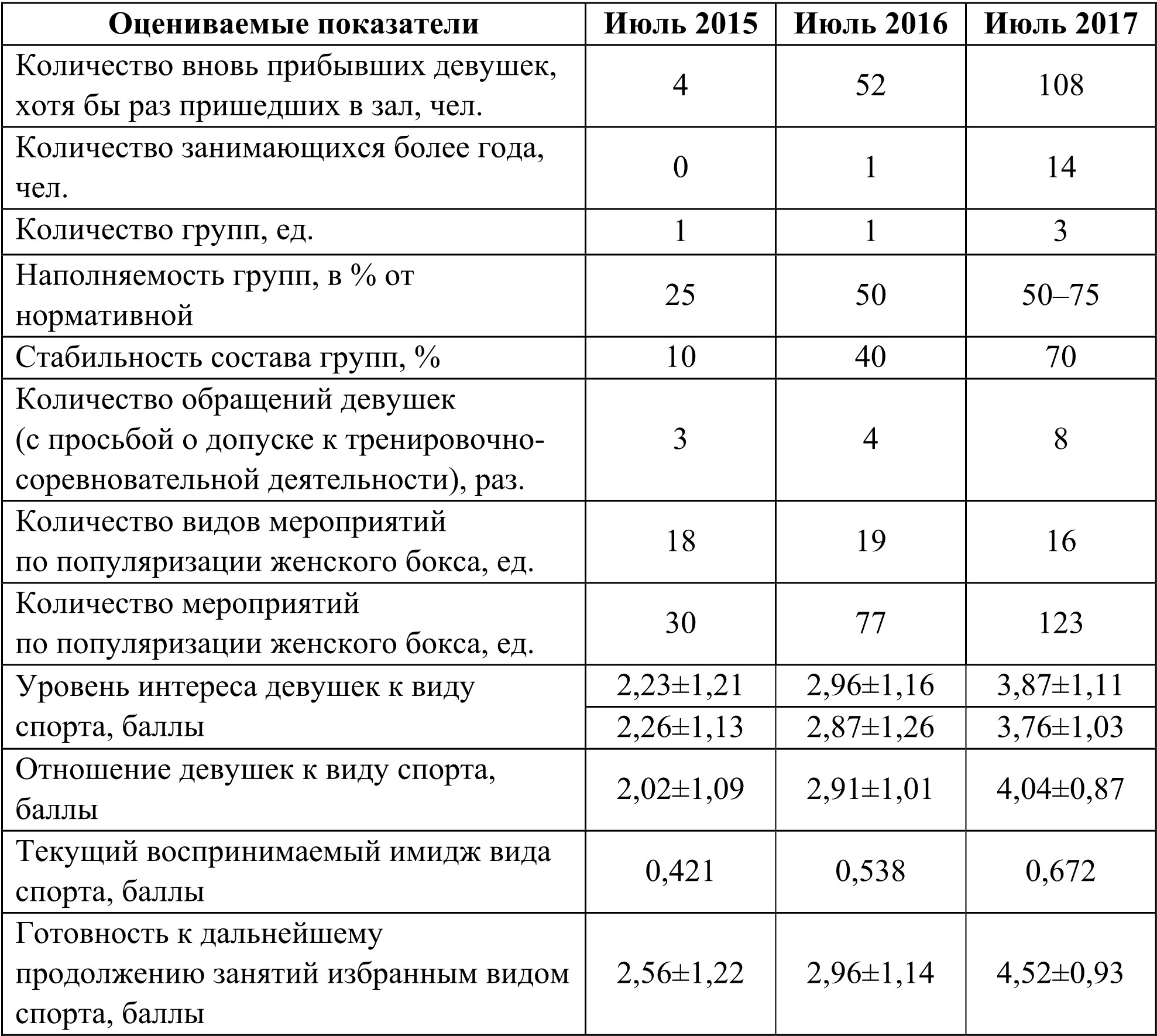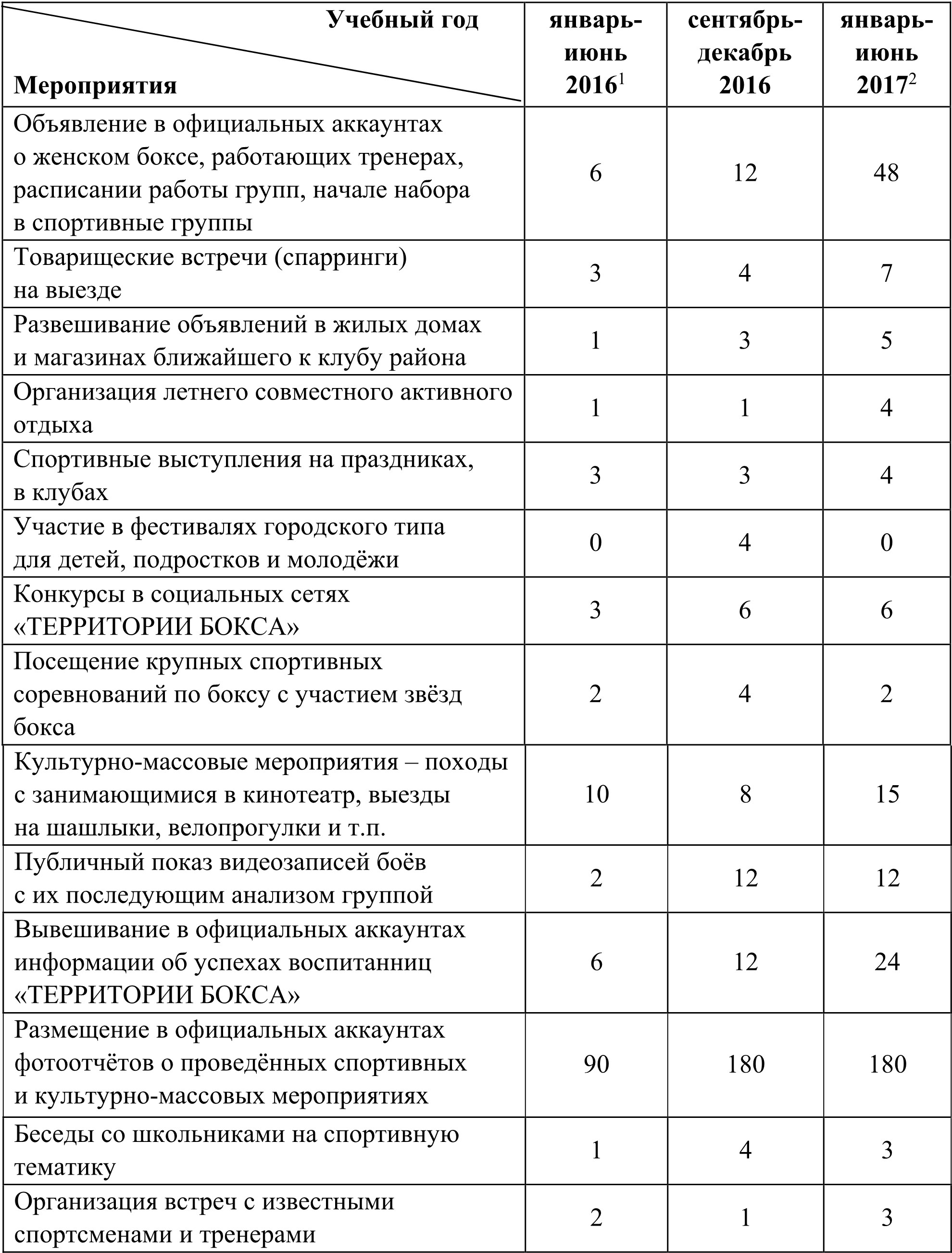 Длительность эксперимента по формированию интереса к женскому боксу, проведённого в региональной общественной организации «Женский боксёрский клуб “ТЕРРИТОРИЯ БОКСА”» г. Санкт-Петербурга204, составила 1,5 учебных года (с января по июнь 2016 г. и полный 2016–2017 учебный год).