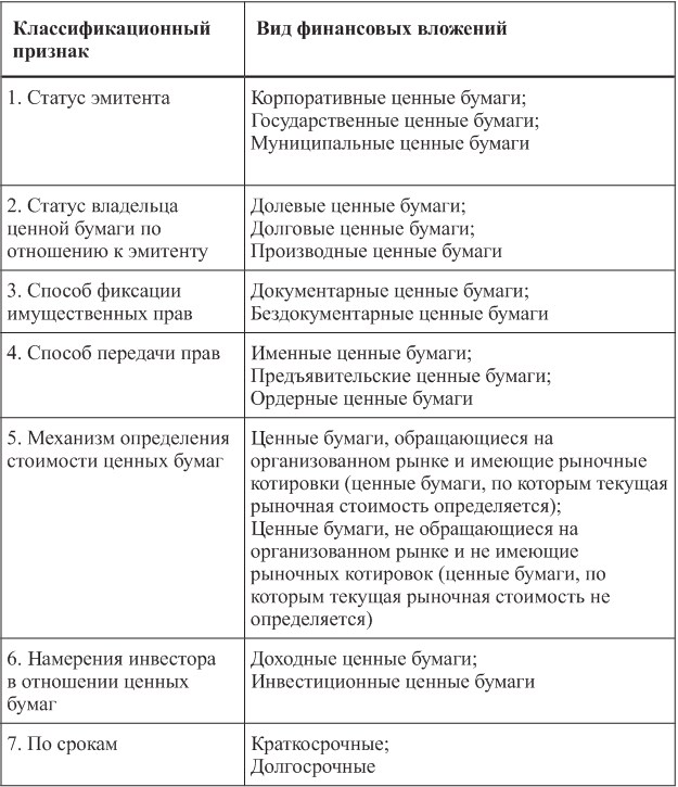 Классификация финансовых вложений в ценные бумаги представлена в табл. 1.